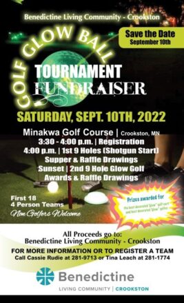 After the first round of nine holes of golf, all the participants will return to the clubhouse to have a meal from the Kitchen at the Kwa. While the participants eat, the Benedictine staff will go out onto the course and light up the field with glowsticks and lights for the second round of nine holes. “On Saturday, we start at 4:00 with nine holes and do one round of golf, then there’s a meal, and then once the sun sets, during our meal, our staff and volunteers go out and light up the golf course and all of the participants light up their golf carts,” Benedictine Foundation Development Director Cassie Rudie explained. “We use glow balls, and they do nine holes in the dark, and it’s a fun event, and it’s fun to be out on the golf course and see everything all lit up.” Along with having prizes for the best score, the Community is also giving out prizes for the best decorated “glow” golfer and the golf cart made with the glowsticks or any accessories the participants bring from home. “That’ll be a time for the teams to come together and socialize, and the staff and volunteers time to go out and get the course all lit up, and then those teams can decorate their carts all lit up,” said Rudie. “Most of the time, they bring in their own things. We provide some things, like the glow ball and accessories, but we’ve had some people, who in the past have gone all out, and their carts are pretty decked out. It’s always fun to see how creative people are and what they come up with when it comes to decorating their carts or themselves.” Along with the supper, the Community will also have raffle drawings for various prizes people can enter to win. The prizes include gift certificates from several local businesses in Crookston and surrounding communities and a “fun” cooler full of various liquors and drinks.