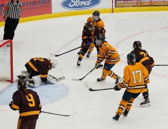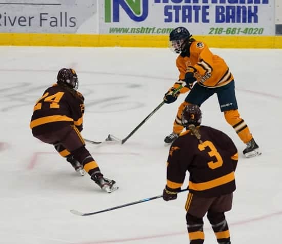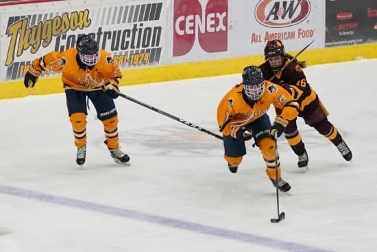 The two-goal lead lasted for precisely five minutes when the Raiders, Puppe particularly, broke out from center ice, and she developed a two-on-one with Tove Sorenson. Puppe drew the defenders toward her and slipped a perfect pass to Sorenson, who buried it from about seven feet out to draw the Raiders within a 3-2 deficit with about seven and a half minutes left in the game.