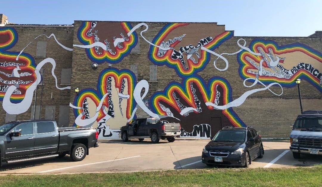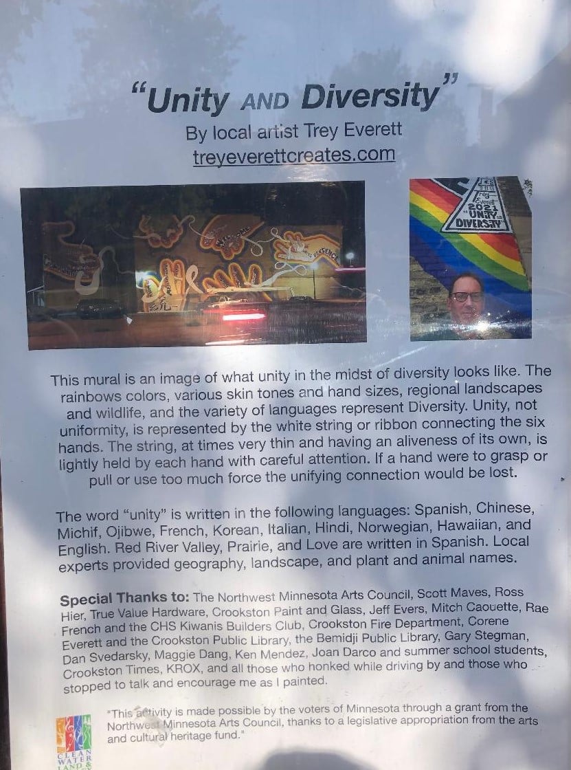 The mural is located on the south side of Scott’s True Value Hardware Store in Downtown Crookston and represents unity during diversity.