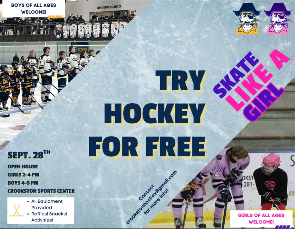 The Crookston Blue Line Club will host a try hockey for free for all boys and girls on September 28 at the Crookston Sports Center.