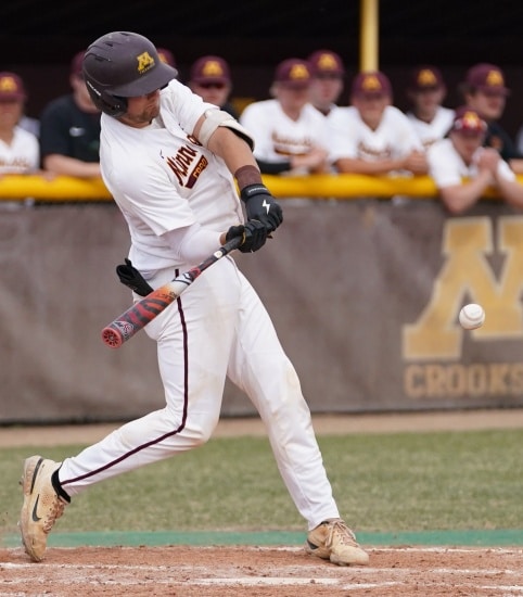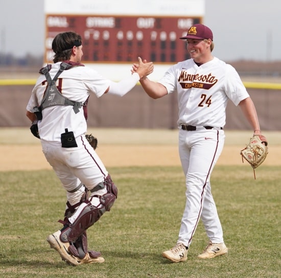 The University of Minnesota Crookston (UMC) Golden Eagles Baseball team has an outstanding pitching performance from Jake Osowski (EGF) and timely hitting to beat Southwest Minnesota State 8-0 but lost the second game 12-2 in seven innings.