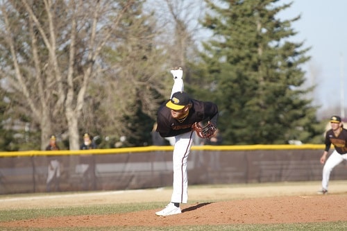 UMC didn’t waste any time in the bottom of the first inning when Ben Bryant (Soph. Fargo, ND) led off the inning with a double. Will Zimmerman (Sr. Park River, ND) was hit by a pitch and Mason Ruhlman (Sr. Algonac, Mich) reached on a fielders choice and a run scored for a 1-0 lead. After another Golden Eagle out, Scott Finberg walked and Jake Hjelle (Fresh. East Grand Forks) reached on a fielders choice and two runs scored on an error for a 3-0 lead. Hjelle scored on a wild pitch and the Golden Eagles led 4-0 after one inning of play.