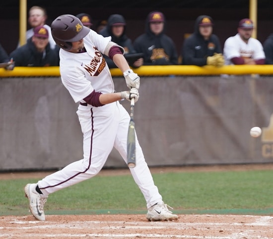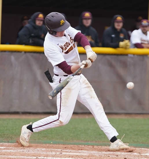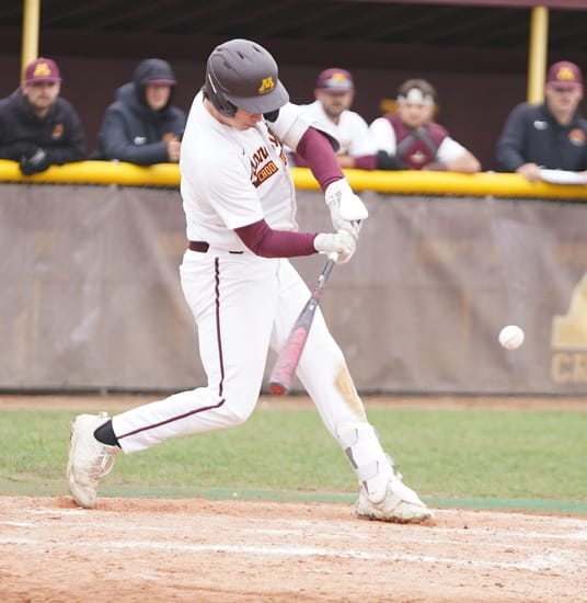 UMC pitcher Jake Osowski (Sr. East Grand Forks) had a great start as he retired Duluth in 1-2-3 fashion. UMC’s bats got going with the first batter as Sawyer Satrom (Soph. Portland, ND) led off with a single. The next two batters were retired before Jake Hjelle (Sr. East Grand Forks) hit a two-run homerun for a 2-0 lead.