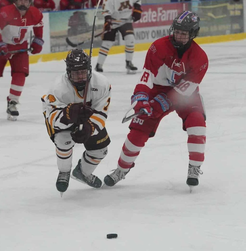 UMC would win the opening faceoff and never look back. The Golden Eagles maintained steady puck control throughout the game’s opening stages, and fired many early shots. The first goal of the evening was scored by UMC just under 8 minutes into the period. Tristan Morenault lasered it in off assists from Jackson Dodds and Aiden Morelli. The Johnnies would get a couple of fast break chances, but two saves by Golden Eagles goalie Tyler Swanson kept the game at 1-0. UMC would put in another goal at the 8:24 mark, as Fox Dodds hit from close range. The Golden Eagles weren’t finished yet, as Tristan Morenault scored his second goal of the evening just under 11 minutes into the game to extend the lead to 3. UMC well controlled the next two minutes, and the Golden Eagles scored a fourth goal at the 13:16 mark. Tyler Lorenz and Ben Hines assisted Mitchell Coleman on the score. UMC’s Dylen Neubauer joined the box score with his first goal of the night coming 16:04 into the period, extending the lead to 5. Saint John’s was able to get off a few shots late, but they were unable to cut into UMC’s lead. UMC’s strong puck control led to them outshooting the Johnnies 30-5 in the period.