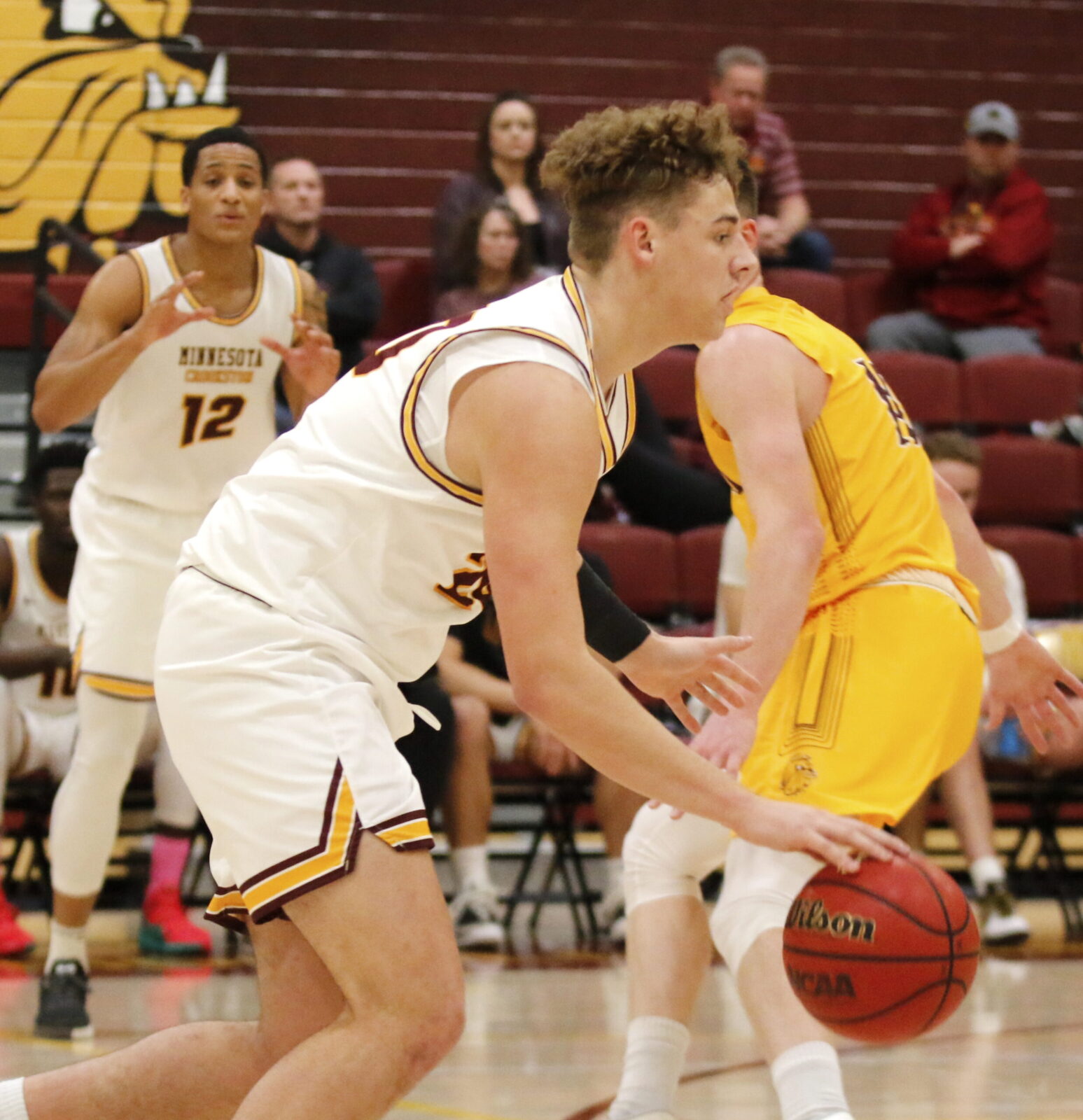 Minnesota Duluth opened the game with a 5-0 lead before Brian Sitzmann (R-Soph., Savage) scored a lay-up trimming UMD’s lead to 5-2 with 18:25 to play in the half. Another 5-0 run by the Bulldogs extended their lead to 10-2 before Malcolm Cohen (R-Sr., Detroit, MI) scored two straight baskets bringing the Golden Eagles within 10-6. A pair of Harrison Cleary (Sr., Oak Creek, WI) free-throws cut Minnesota Crookston’s deficit down to 22-14 with 6:10 to play in the half, before Minnesota Duluth went on a 7-0 run increasing their lead to 29-14. UMD extended their lead to 20 before Harrison Cleary made a three-pointer for the last basket of the first half as UMC went into the locker room down 36-19 at halftime. “We had to find energy,” said UMC head coach Dan Weisse. “We were in the game for a long time, and then the wheels fell off. There were a few different reasons for that, but that’s on us. We’ve got to have a different energy about us.”