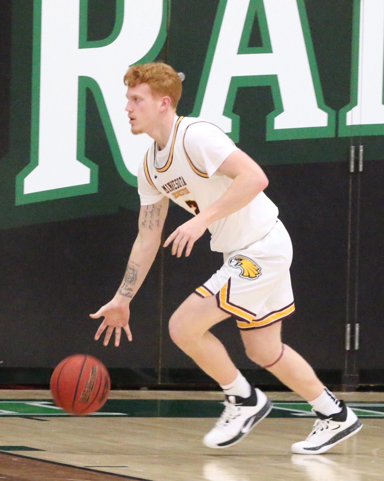 Concordia-St. Paul’s roster featured eleven new players and was playing their first game of the season, giving UMC little to evaluate in preparation for the game. Concordia St. Paul got off to a quick start as Jordan Coblin (Jr., Boca Raton, FL) scored the games first 9 points with three three-pointers giving the Golden Bears and early lead. Harrison Cleary (Sr., Oak Creek, WI) connected on a mid-range jump shot along the baseline to open Minnesota Crookston’s scoring 4:34 into the game, but Concordia-St. Paul remained red hot from beyond the arc, extending its lead to 15-2. Brian Sitzmann (R-Soph., Savage) made UMC’s first three-pointer as part of a personal 6-0 run brining the Golden Eagles within 15-8. After Concordia-St. Trailing 24-16, Minnesota Crookston closed the first half with an extended scoring run, including Tyrese Shines’ (Fr., La Grange, IL) first basket of his career tying the game at 30-30. Noah Kannergiesser (Soph., Hancock) beat the buzzer for the final basket of the first half giving Concordia-St. Paul a 32-30 halftime lead. “We didn’t have energy (to start the game),” said UMC head coach Dan Weisse. “That was certainly a message at halftime. I don’t want to be that team that when you make a shot, that’s when you have energy. We couldn’t make a shot and missed a couple of really good looks, but you’ve still got to have energy. I think that had a lot to do with it.”