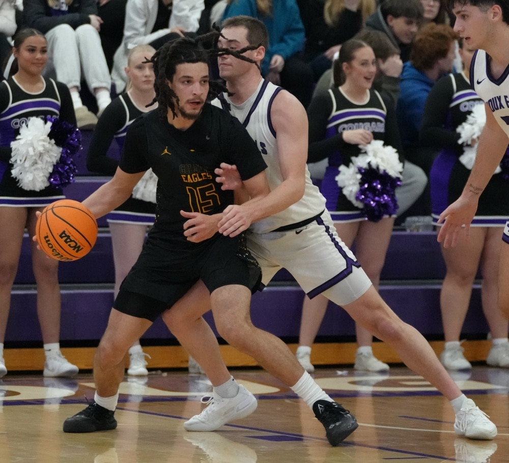 Sioux Falls responded with a 7-0 run. The Golden Eagles stopped the run with a three-pointer from Spencer Swenson (Fresh. Sauk Rapids). UMC trailed 37-33. Trailing 40-35 with one minute left, Swenson made a tough shot, and with seven seconds left in the half, UMC’s Brady Westphal (Fresh. West Fargo, ND) set a pick and was thrown down to the ground by the neck by a Cougar player, and a technical foul was called. Westphal made both free throws to bring the Golden Eagles within a 40-39 deficit, and that was the score at halftime.