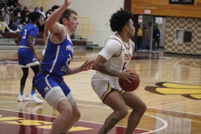 UMC jumped out to a 7-3 lead four minutes into the game with a layup from Zen Goodridge, a basket from Leonard Dixon and a three pointer from Uzo Dibiamaka. Mayville State responded with an 8-3 run to take an 11-3 lead two minutes later. The first-half was a good back-and-forth battle the rest of the way as UMC answered with Dixon scoring four straight points, followed by a Zach Westphal layup for a 16-11 lead. Mayville State battled back to tie the game at 23-23 with 7:24 left in the half. The teams exchanged points for the final seven minutes and Mayville State scored the final five points of the half, all in the final 36 seconds to take a 39-36 lead into halftime. Both teams shot exactly 50 percent from the field, while UMC out rebounded Mayville State 21-10.