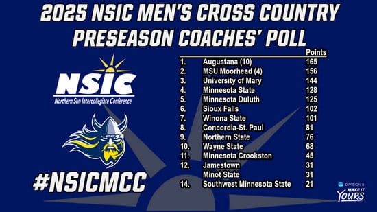 The Golden Eagles were picked ahead of the University of Jamestown, Minot State University, and Southwest Minnesota State University. Augustana University was selected to finish first with 10 first-place votes, while Minnesota State University Moorhead was picked second with four first-place votes. MSU Moorhead’s Chase Hoechst was selected as the Preseason Athlete of the Year.