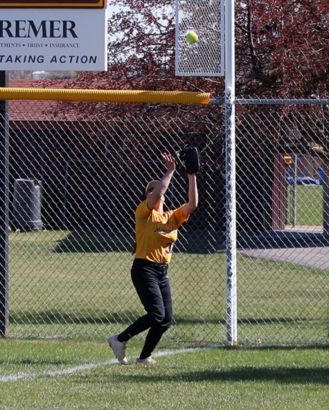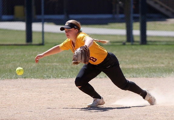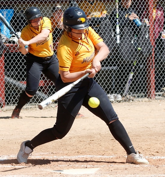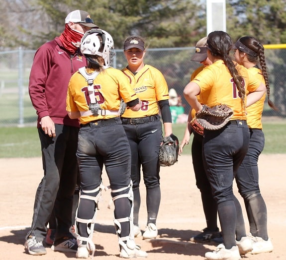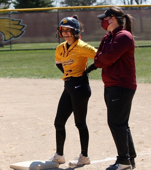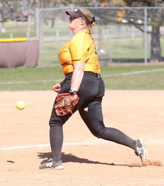 The UMC Golden Eagles softball team got an outstanding pitching performance and a big home run from a couple of their Seniors as they got a 4-1 win in game one of a doubleheader with Minot State. In game two, UMC had a furious rally late to tie the game, but Minot State was able to pull away for a 9-7 victory as the teams split the final two games of the regular season.