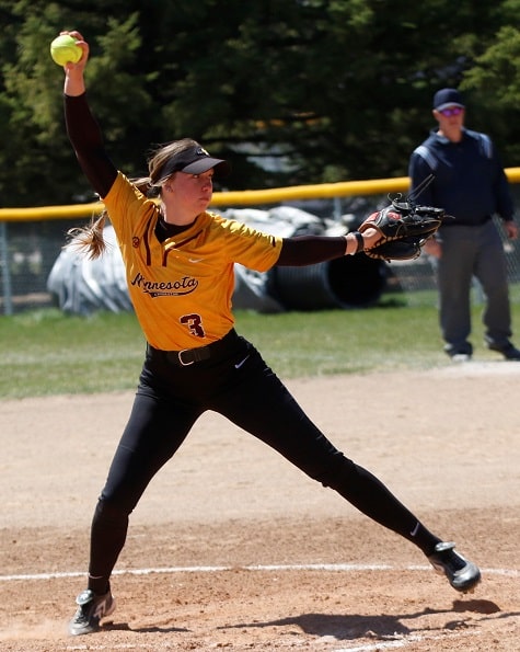 Katie Humhej (Sr. Surrey, British Columbia) finished off her brilliant day, and final start of her career, in the circle with two more scoreless innings, including a 1-2-3 seventh inning. Humhej went the complete seven innings, allowing just the one unearned run on just four hits and one walk, and she recorded seven strikeouts to lead the Golden Eagles to the 4-1 victory in game one of the doubleheader. “She did great. Really cool to see her finish her final start with a win against a really good hitting Minot team,” said Coach Owen.