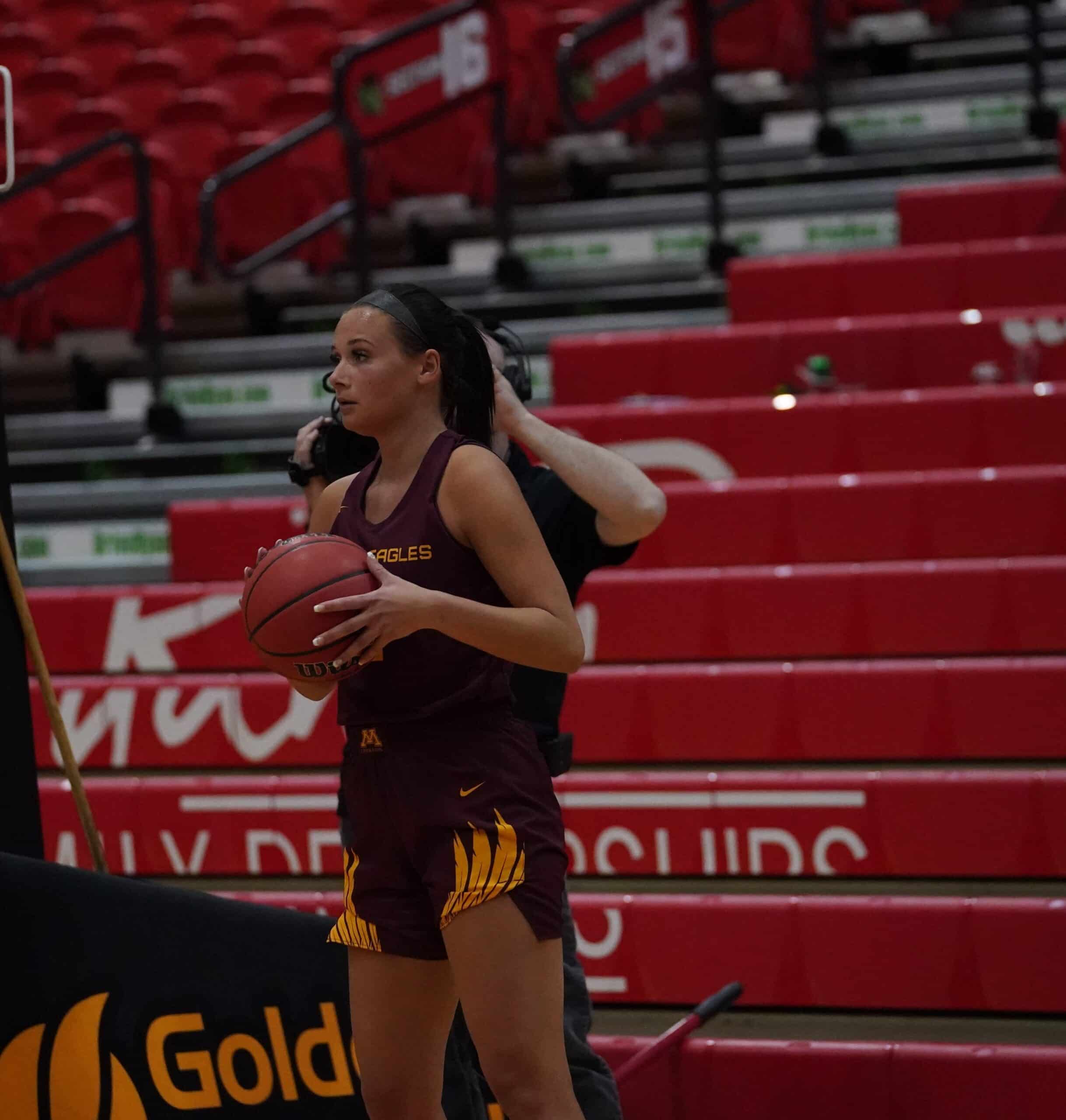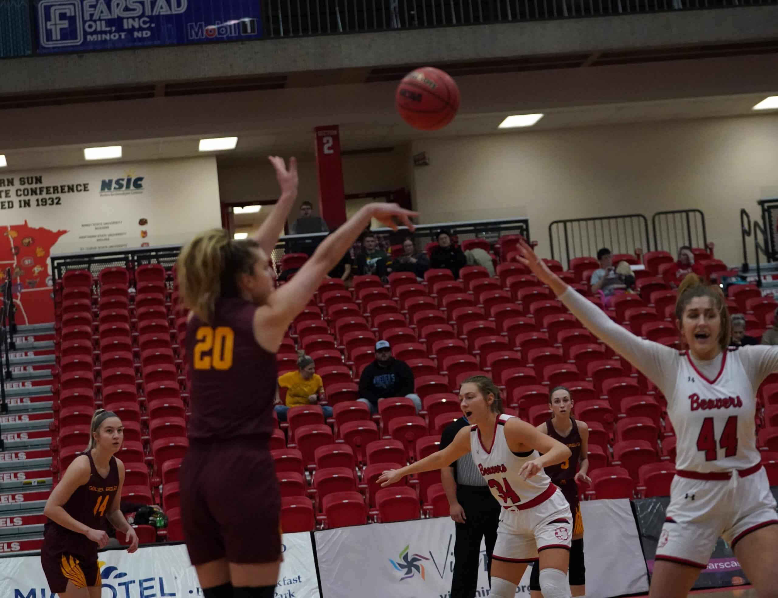 Minot State exploded for 24 points in the second quarter, on their way to a 10-point lead at halftime. The Beavers started scoring the first four points before a Bren Fox (Jr. Norwood Young America, Minn.) jumper made it 16-15 Minot State with 7:26 to play until halftime. The Beavers would slowly build their lead to 26-19 before the Golden Eagles would get baskets from Mary Burke (Sr. Virginia, Minn.) and Bren Fox (Jr. Norwood Young America, Minn.) to cut the Beavers lead to 26-23. Minot State would score the next ten points to blow the game open before an Alex Page (Fr. Grand Forks, N.D.) three right before the buzzer sounded made it 36-26 Beavers heading into halftime. “I’d like to find some consistency,” said UMC Head Coach Mike Roysland. “We have some girls that play great minutes at times, and then other times we shoot ourselves in the foot. We need to play consistent basketball for 40 full minutes.” Minot State shot 46% from three-point range to help claim the lead. UMC shot a perfect 8-8 on free throws in the first twenty minutes, but their 8 turnovers were costly as the Beavers scored seven points off turnovers.