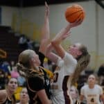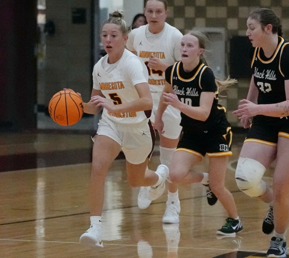 Both teams came out and played solid defense and that made for a low-scoring first quarter. UMC struck first with a Rayna Klejeski (Jr. Barnum) basket before the game was tied at 2 and 4. The Golden Eagles’ Riley Jenkins (Jr. Galesburg, Ill) backed her way into the post and then hit a fade away jumper for a 6-4 lead. Black Hills State answered with a three-pointer to take their first lead of the game with 5:27 left in the quarter. UMC answered with an Emma Miller (Sr. Albertville) layup and an Anna Westby (Fresh. Eveleth) fade away jumper for a 10-7 lead. It was this point a little three-point contest popped up with Black Hills State making a long-range shot to tie the game at 12-12. UMC responded with an Miller three-pointer. Less than a minute later, Black Hills State buried a three-pointer to tie the game at 15 with 2:48 remaining in the opening quarter. The Golden Eagles took the lead back on a Tayden Hanks(Jr. Los Lunas, NM) fastbreak layup and Miller added two free throws for a 19-15 lead. Black Hills State made a thre-pointer to get within a 19-18 deficit going into the second quarter.