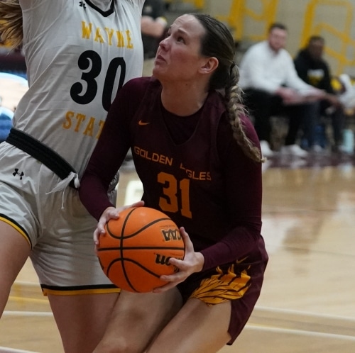 Wayne State’s Brooklyn Kruse scored the first four points of the quarter for a 38-33 lead. UMC’s Miller stopped the run with two free throws and after two more Kruse points, Miller scored four straight points to get the Golden Eagles within a 40-39 deficet. UMC trailed 46-43 when Wayne State ended the quarter on a 7-0 run to take a 53-43 into the fourth quarter.