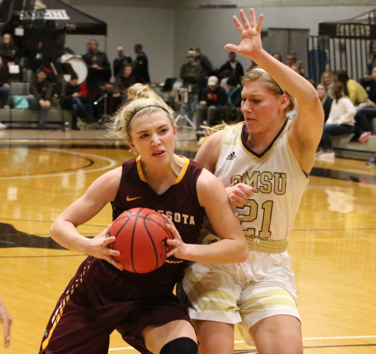 Southwest Minnesota State scored the opening basket with a lay-up and never looked back. After Isieoma Odor (Sr., Bloomington) scored inside at the other end, SMSU scored four straight points to take a 6-2 lead. The Mustangs used another lay-up to take a 10-4 lead with 6:27 to play in the quarter. Kylea Praska (Fr., Thief River Falls) made back-to-back three-pointers pulling the Golden Eagles within 13-12 with 4:11 left in the first quarter, but the Mustangs answered with two straight three-pointers to gain a 19-12 lead. Later in the quarter, another SMSU three-pointer gave the hosts a 26-17 lead but a Paige Cornale (Fr., Oak Creek, WI) three-pointer closed the quarter for Minnesota Crookston bringing the visitors within 26-20 at the end of one quarter. “They made some tough shots,” said UMC head coach Mike Roysland. “They were able to get right to the rim. They did a nice job getting it up and giving it a chance and if they missed they got a second chance rebound. We just kept having to battle back.”