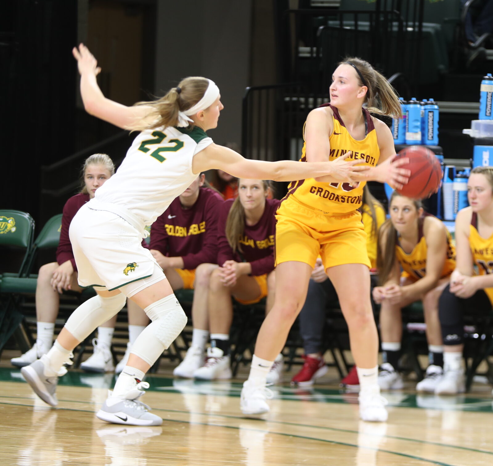 Kylie Post (Soph., Corcoran) scored a lay-up for the first points of the fourth quarter bringing Minnesota Crookston within 62-45. That proved to be the extent of the Golden Eagles comeback bid. The Bison scored six unanswered to pull in front by 23 and continued to surge offensively. Minnesota Crookston failed to make a field goal in the final 4:49 of the game as NDSU closed out an 88-51 win. “It just got away from us,” summarized Roysland. “Especially in the second half. It’s always easier to build off playing well, rather than playing poorly. This will really be a good learning tool, and these kids have the right attitude. We’ll learn from this. These kids will bounce back, and we’ll be ready come next weekend.”