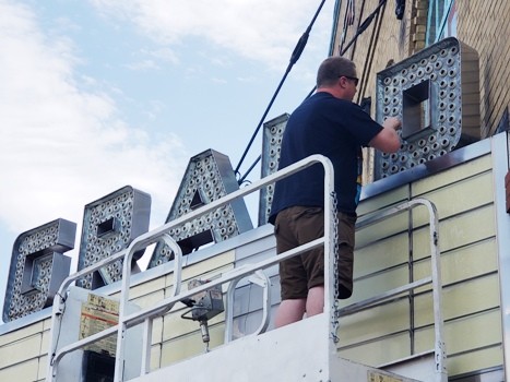 But the outside of the building is also a step back in time with the GRAND marquee from the 1970s.  The theatre’s owner Brian Moore is working this summer to sand, paint and replace the lights to give the vintage marquee a fresh look. “It’s something I’ve always wanted to do since I’ve owned the place,” said Moore. “I’m sanding and painting the GRAND letters on both sides of the marquee.  I’m also putting new lights behind the letter board and hopefully orange neon around the front.”
