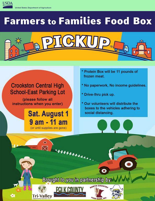 The USDA Farmers-to-Families Food Box pick-up in Crookston is set for Saturday, August 1st from 9:00 a.m. to 11:00 a.m., or until supplies are gone. The pick-up location will be at the Crookston High School east parking lot. Those who drop by are asked to follow instructions while entering. Danelle Amiot of Polk County Social Services helped organize the event, and she hopes traffic will move through as smoothly as possible.