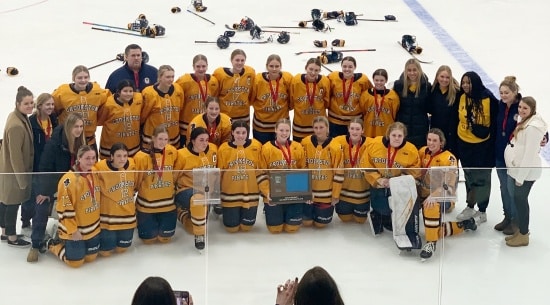 Warroad continued to control play as they scored two goals in 70 seconds to take a 3-2 lead. Warroad tied the game at 2-2 when Sophie Johnson got a pass back to Marcowka at the point, and she let a wrist shot go that sailed into the upper right-hand corner of the net for a goal as Freije was screened and couldn’t see the puck. 70 seconds later, Karlee Kalbrenner got a pass at the top of the circle and blasted a one-timer into the net to take a 3-2 lead with 5:48 left in the game.