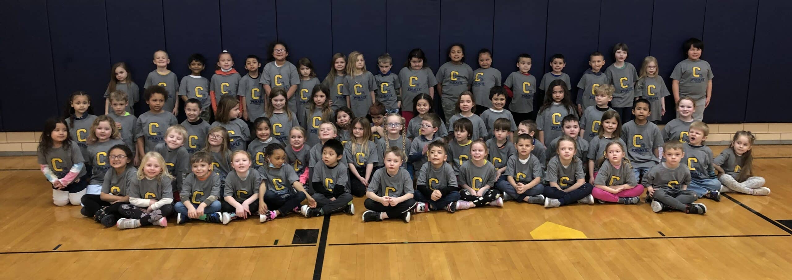 Washington School Kindergarten celebrated Pirate Pride while posing for a photo. The Washington and Highland Schools PTO groups contributed money to purchase a Pirate Pride shirt for each kindergarten student. With the effort of Lorri Capistran, a member of both schools’ PTO groups, each child was able to order and receive a preferred shirt size. For several years, students at Washington School have received a Pirate Pride shirt that can continue to be worn as students move to 1st Grade at Highland School. Thank you to Lorri Capistran for overseeing the project and distribution each year.