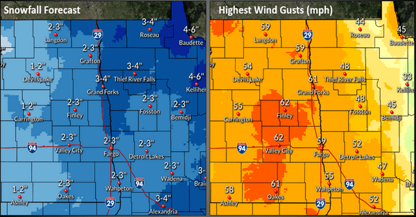 *WHAT…Blizzard conditions are possible. Significant reduction to visibility will impact travel. Total accumulation 2 to 6 inches (highest toward NW Minnesota). Strong Northwest winds 50 to 60mph (high confidence). Wind chills falling to 20 to 35 below zero Wednesday. There is a potential for a little mixed precipitation at the onset before a full transition to snow. Blowing snow may linger into the afternoon hours on Wednesday after the main snow leaves the area.