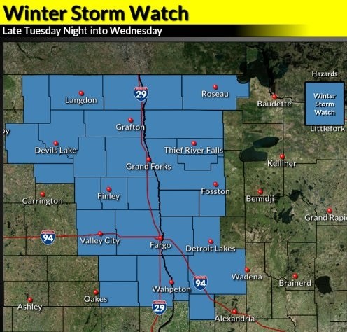 The National Weather Service in Grand Forks has issued a Winter Storm Watch for northwest Minnesota and eastern North Dakota from Tuesday night to Wednesday evening.